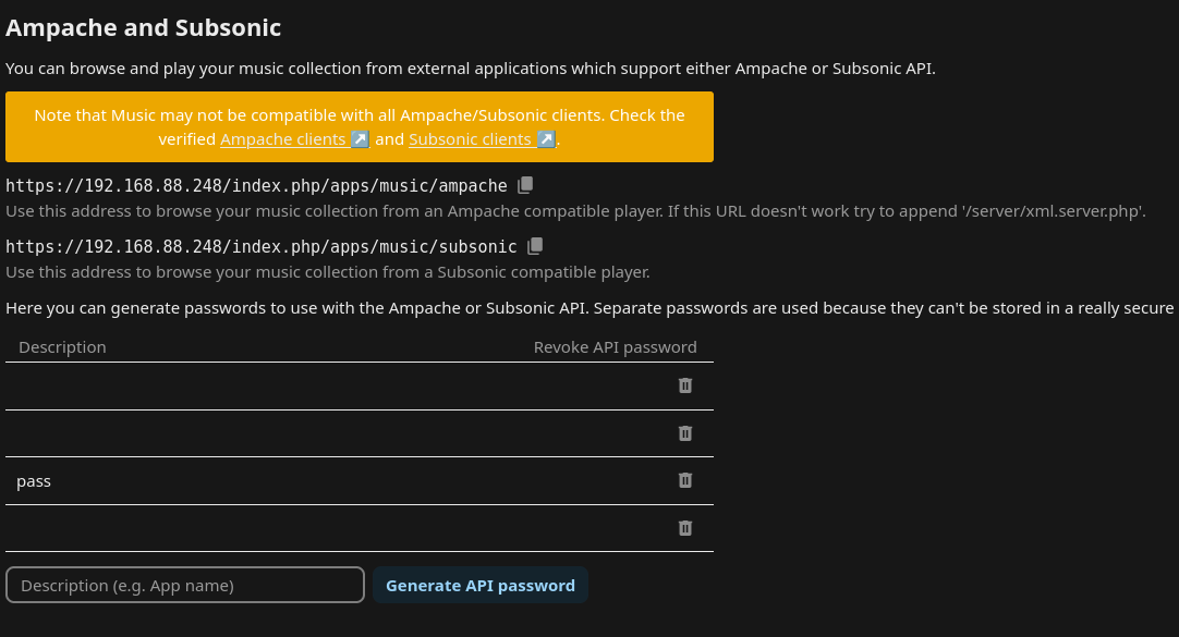 But the Music app has a trick up its sleeve. It can work as a server for any apps that use either the Ampache or Subsonic protocols. Auth is being done via generated API credentials.