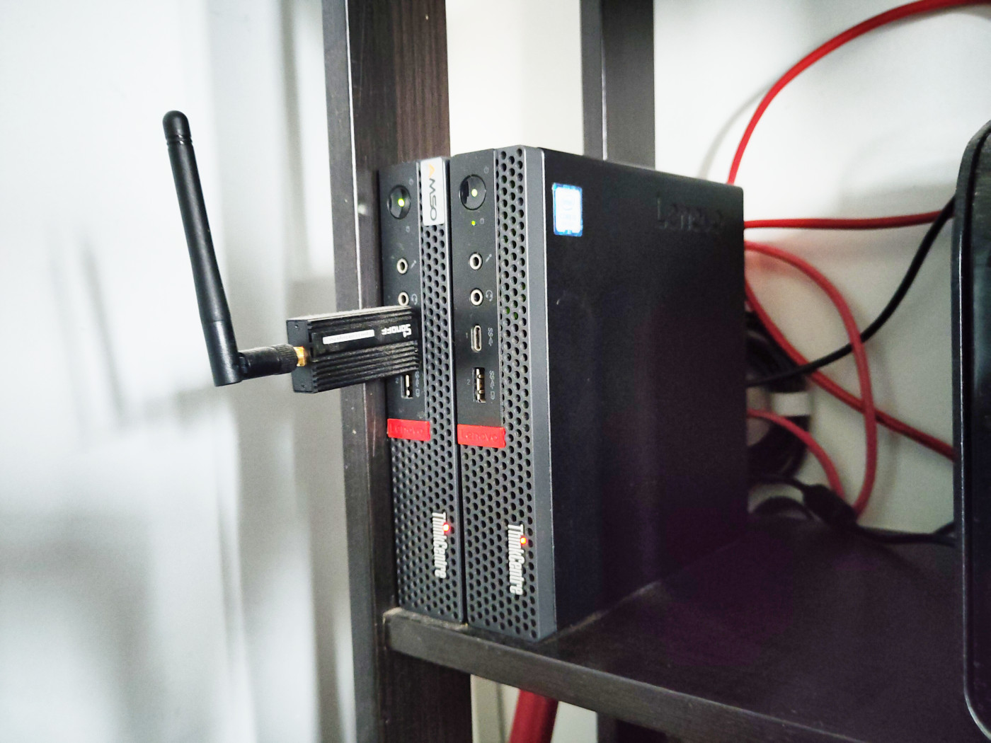 My computing shelf. The Thinkcentre on the left is my Home Assistant box with a Zigbee dongle, and the right one is the new Proxmox node.