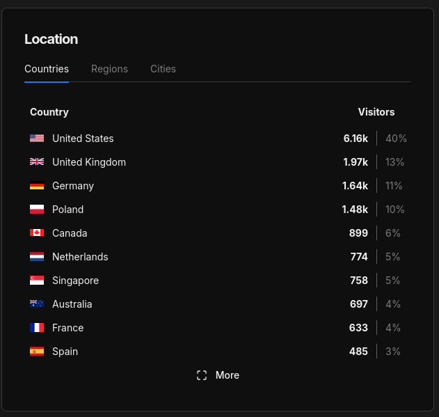 More than half of my visitors come from English speaking countries, then there’s Germany, and Poland is fourth. Netherlands and Singapore make suprisingly high numbers, taking in mind their size. I mean the size of the countries, I met some Dutch people at my previous work, and it felt weird being of mid height compared to them. And the Dutch have a very big presence in the Fediverse, as least that’s what I’m seeing.